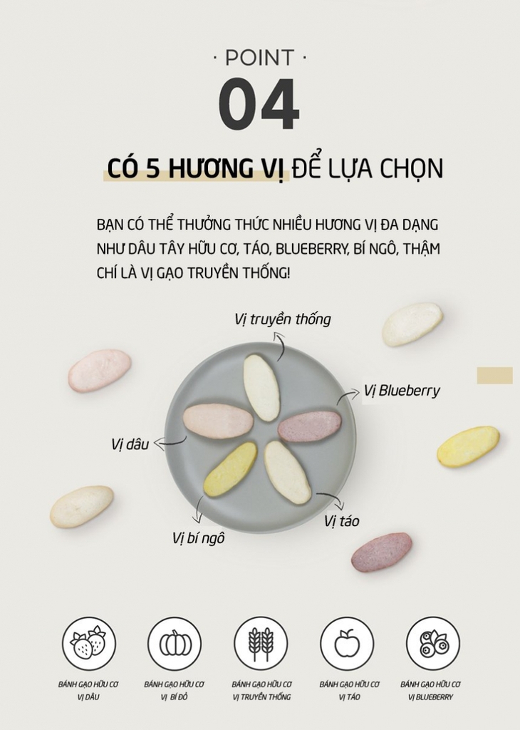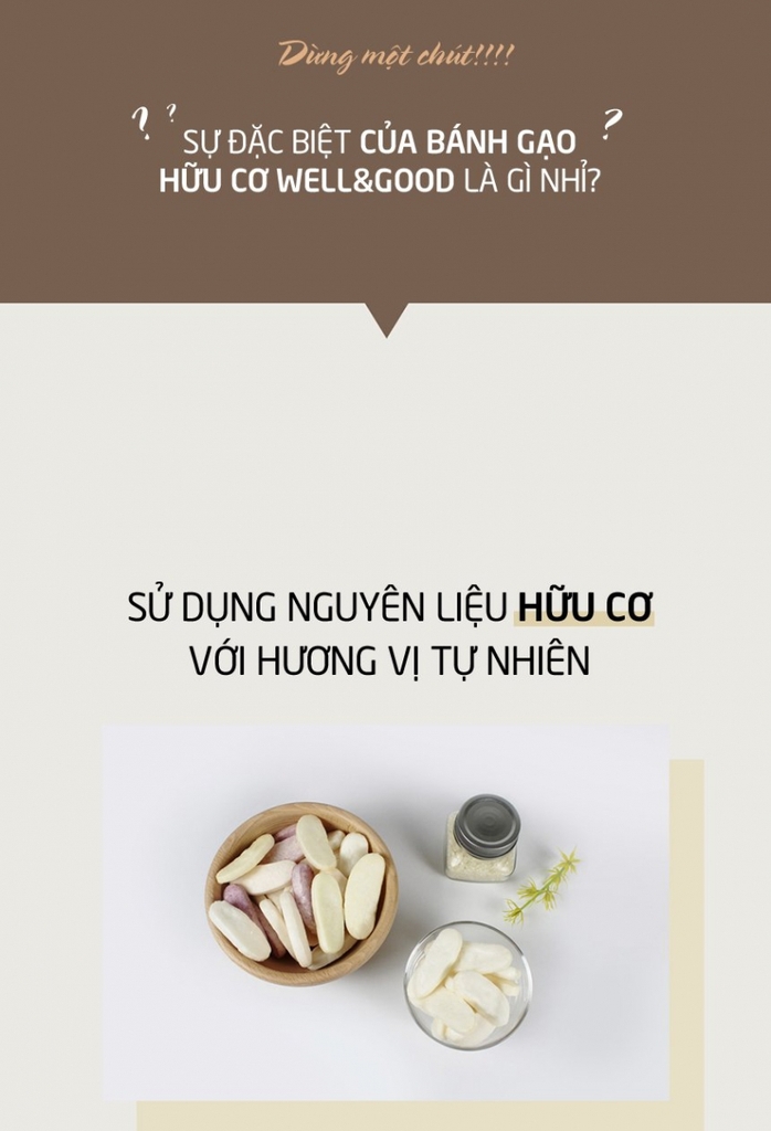 - Bánh gạo hữu cơ giàu vitamin D, bổ sung 55mg canxi giúp bé phát triển khung xương và răng, thúc đẩy tăng trưởng chiều cao vượt trội.