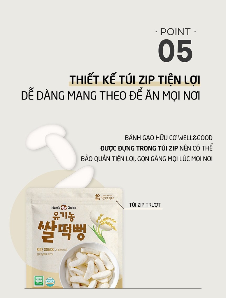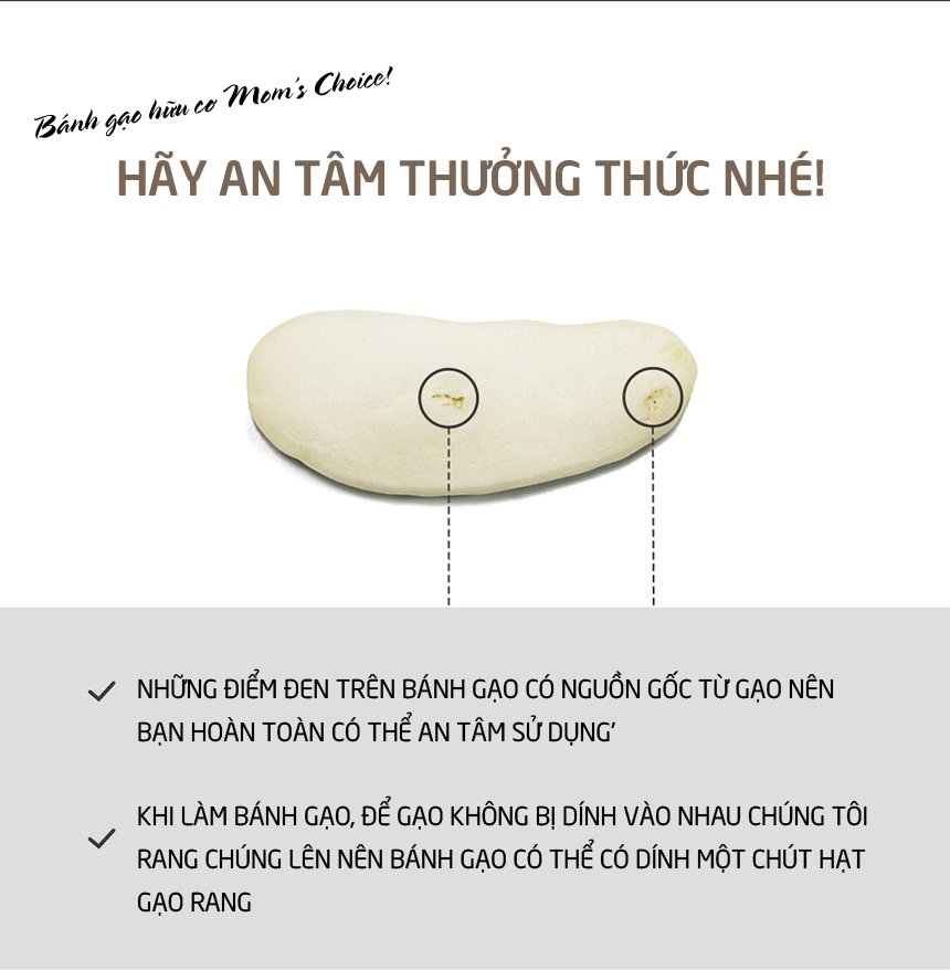 - Bánh gạo hữu cơ Mom's Choice dạng dẹt (25g) là món bánh ăn dặm bổ sung các dưỡng chất hữu cơ tự nhiên từ thực vật. Sản phẩm rất thích hợp cho bé tập ăn dặm - vừa bổ dưỡng, vừa tiện lợi - bé tập cầm nắm và nhai rất tốt.