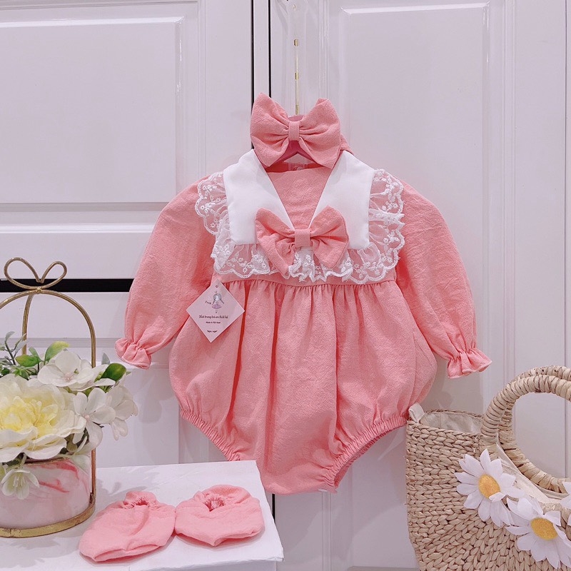 Body hồng cổ thuyền viền ren tay dài (kèm Turban nơ + Bao chân)