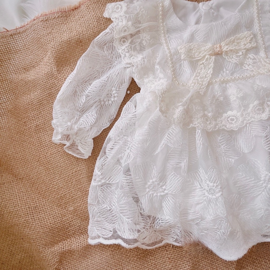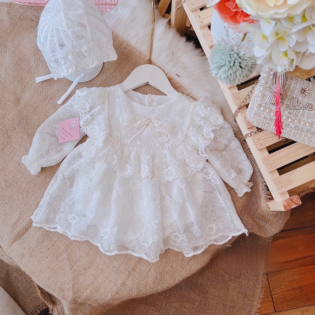 Body váy trắng ren viền dây ngọc (Kèm mũ)